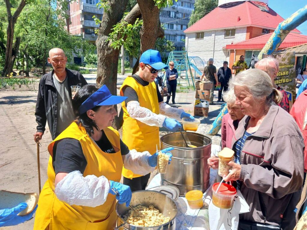 Wir führen Lebensmittelprogramme in der Stadt an der Frontlinie Dnipro sowie in mehreren Regionen durch. Derzeit haben wir drei feste Standorte, an denen jeweils 80 bis 150 Menschen pro Woche versorgt werden. Insgesamt erreichen wir so über 400 Menschen die Woche. Zu den Empfängern der Hilfe gehören Menschen, die aus ihrer Heimat aufgrund des Krieges und der ständigen Bombardierung fliehen mussten. Viele von ihnen haben keine Arbeit mehr. Auch haben viele von ihnen alles verloren: ihre Häuser, ihre Dokumente und ihre Angehörigen. Wir organisieren für sie warme Mahlzeiten, Kleidung und seelsorgerischer Betreuung.